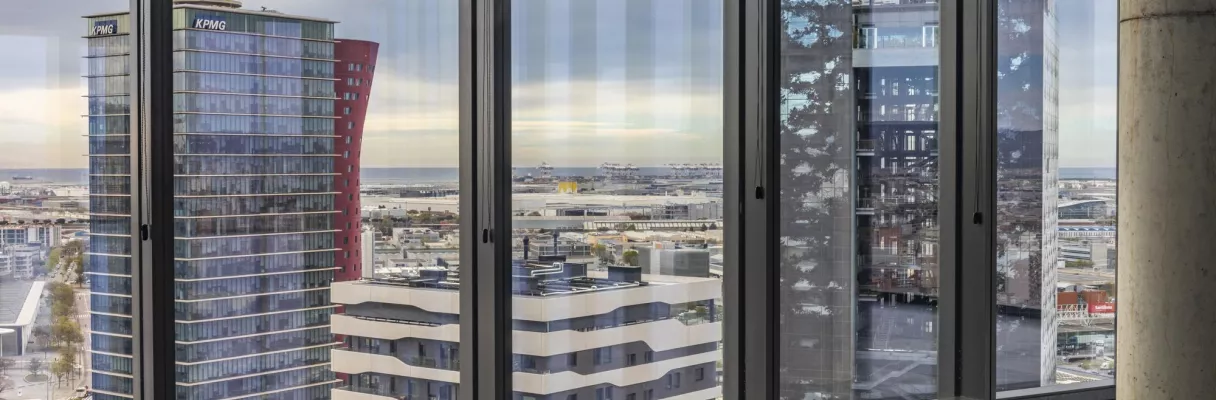 Ostrý úhel mrakodrapu proniká jako čepel nože panoramatem Barcelony