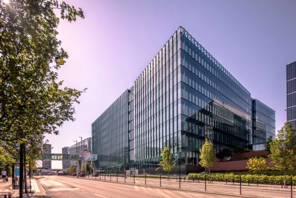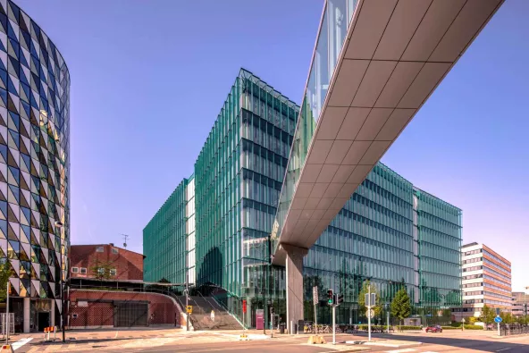 Společnost CF Moller Architects navrhla pro fasádu kombinaci vrstveného skla s povlakem Stratobel 88.2 a ipasol Ultraselect 62/29, která pohlcuje a odráží část slunečního tepla a světla.