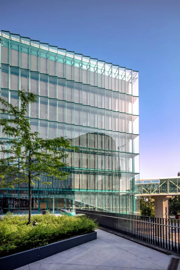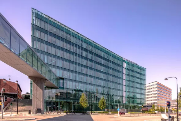 Zelená dvouplášťová fasáda budovy Biomedicum tvoří přechod mezi sousedními budovami Aula Medica a Widerströmska a zároveň se vyznačuje svojí vlastní identitou a designovým rukopisem.