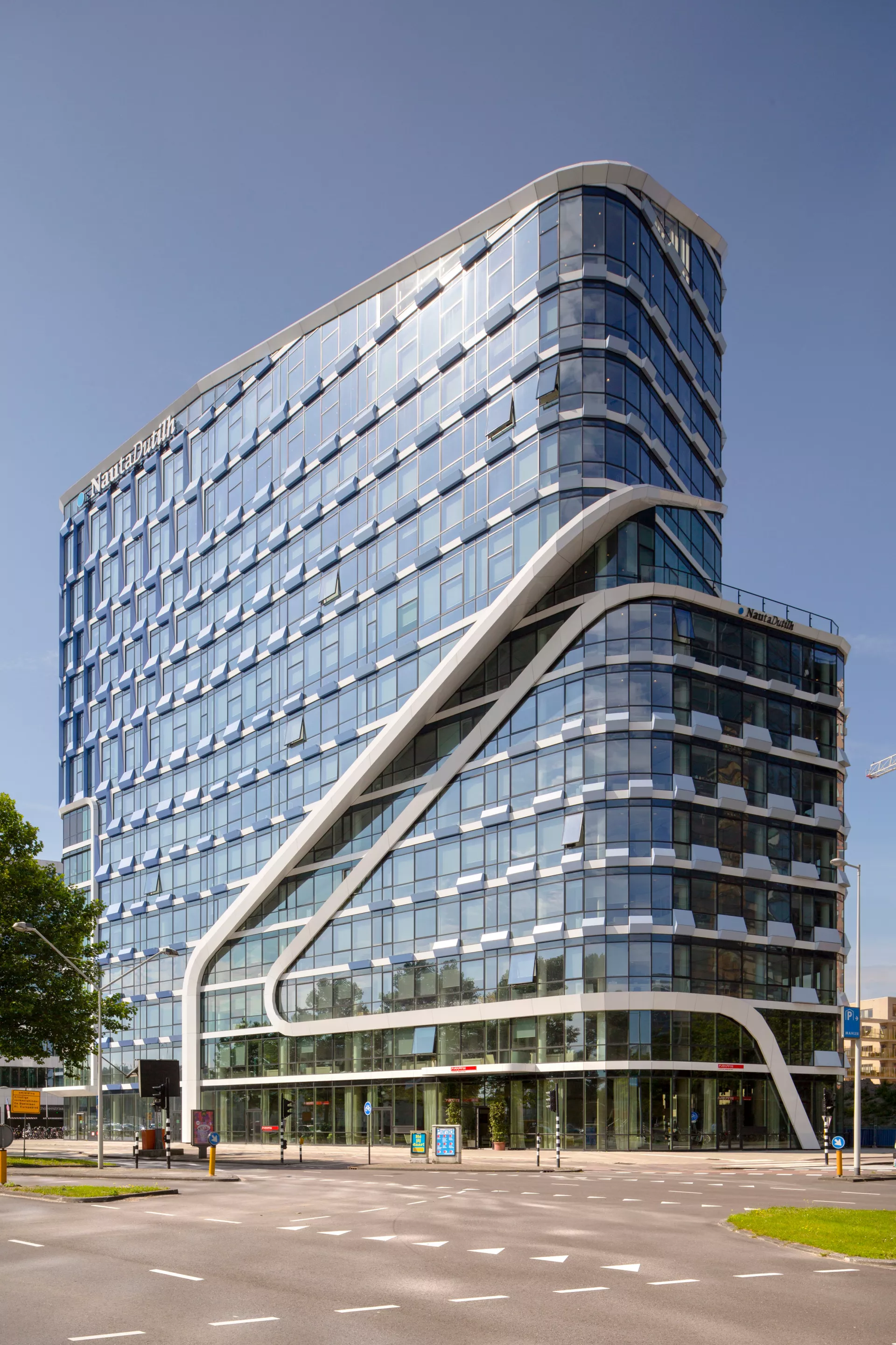 Kancelářská budova NautaDutilh se zaoblenými rohy a dvojím designem, který vyzařuje jak sílu, tak eleganci, je v okrese Zuidas jasným lákadlem pozornosti.