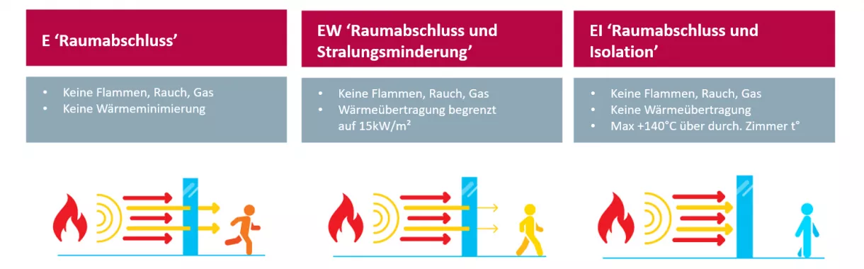 - Das Kriterium „Raumabschluss“ (Widerstandskraft) wird mit Instrumenten für Schutzklasse E bewertet.