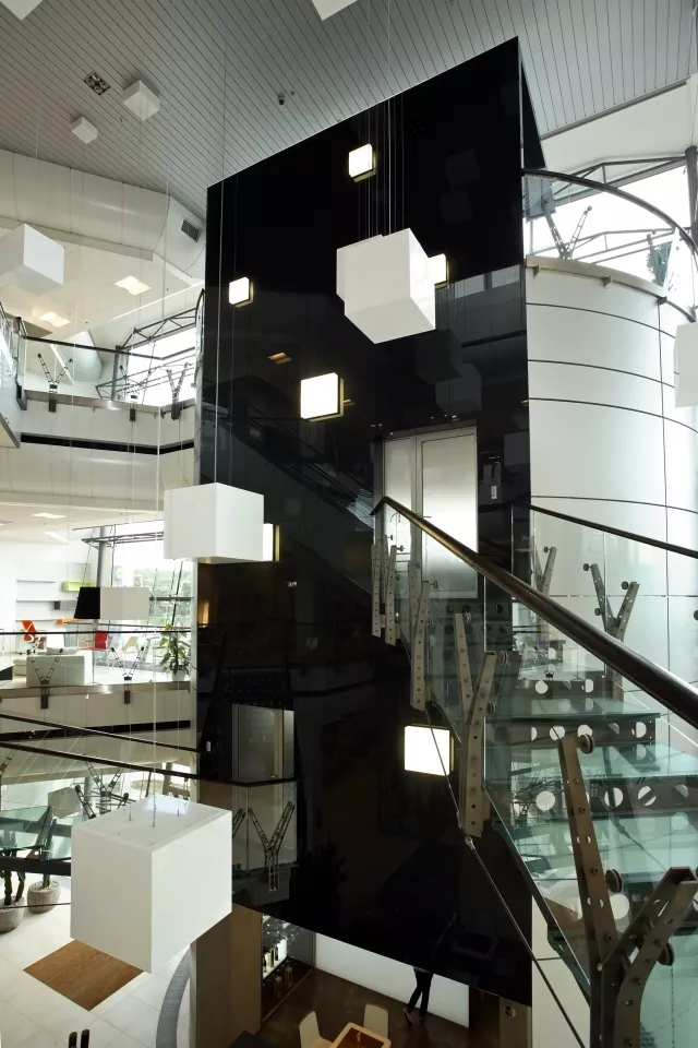 Ein weiterer wichtiger Einsatzbereich im Innenbereich war das Dekor der Aufzüge aus AGC Matelac in drei unterschiedlichen Farbgebungen. Matelac ist zwar mattiert, aber in Fragen der Wartung, der Langlebigkeit und des Aussehens wie normales Glas zu verwenden. Das war genau, was wir brauchten.