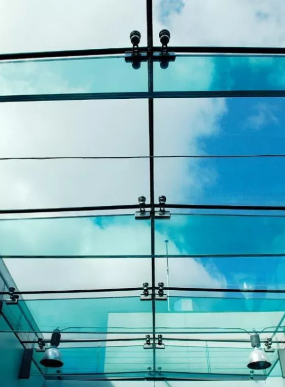 A structural glazing system using single glazing (monolithic or laminated). Can be used to assemble large glass sheets and support external stresses.