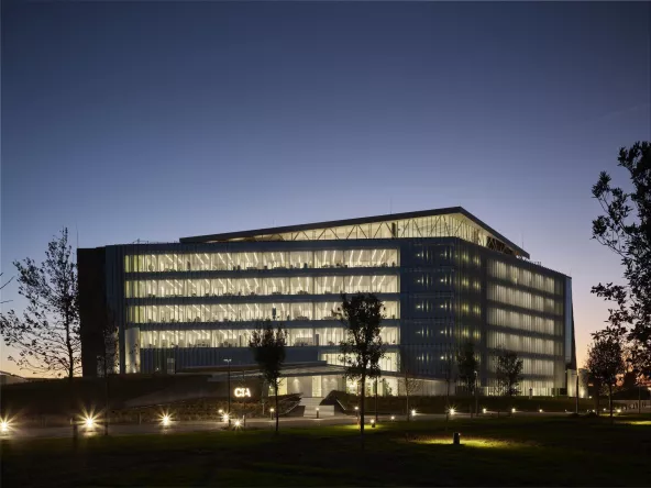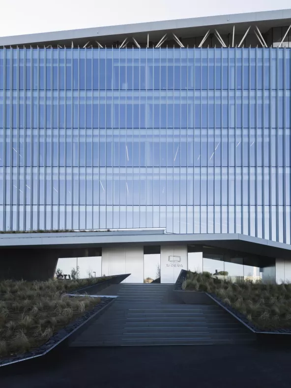 Guided by a pragmatic approach incorporating rationality and functionality, the structure is 100 metres long and 33 metres high, standing on a 3-metre-high plinth. Sidera immediately catches the eye with its generous transparent facades, forming a sophisticated glass skin that envelops the entire building and creating a harmonious balance between interior and exterior. The facades are not only aesthetic, but have been designed to let in abundant natural light, flooding every workspace. Since precise lighting management is essential for promoting employee well-being and productivity, the light fixtures follow the 24-hour circadian rhythm. The facades feature AGC Stopray Smart 51/33 solar control triple glazing. Designed to deliver an optimal balance between solar control and light transmission, this product is the ideal solution for applications requiring abundant natural light, protection from excessive heat and high energy performance – all in a modern design. All Stopray Smart products give processors a choice: they can opt to keep the annealed glass or have the glass tempered, depending on the building's specific requirements. Either way, the glass always guarantees the same energy, light and insulation performance. Offering a single product suitable for two use cases has the benefit of reducing storage requirements. In addition to the glass selected for its 5,000 m2 of glazed facade, Sidera also stands out for its striking use of two other elegant and restrained materials: aluminium, as featured in the six kilometres of vertical fins, and black concrete. The aluminium fins dynamically reflect natural light, depending on the time of day and weather conditions. This, combined with the closely-set sunshade fins, creates a pleasing illusion: depending on the viewer's position, the building appears either opaque or transparent.
