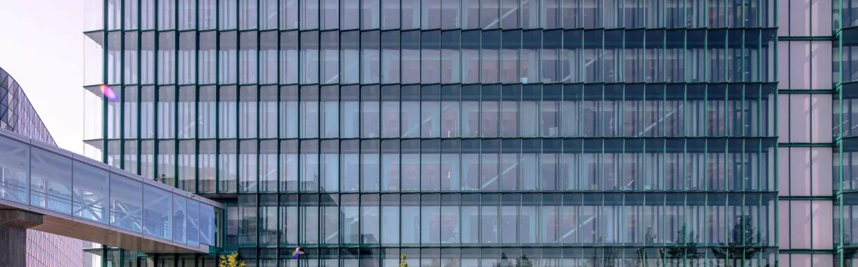 All-glass facade combining flat and curved glazing rises up in the city centre
