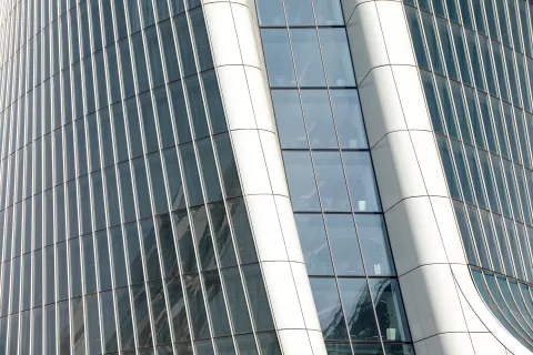 Vidrio de control solar altamente reflectante con agradables reflejos ámbar en la posición 1. En la posición 2, el vidrio con capa muestra una elegante tonalidad bronce gracias al vidrio bronce de base.
