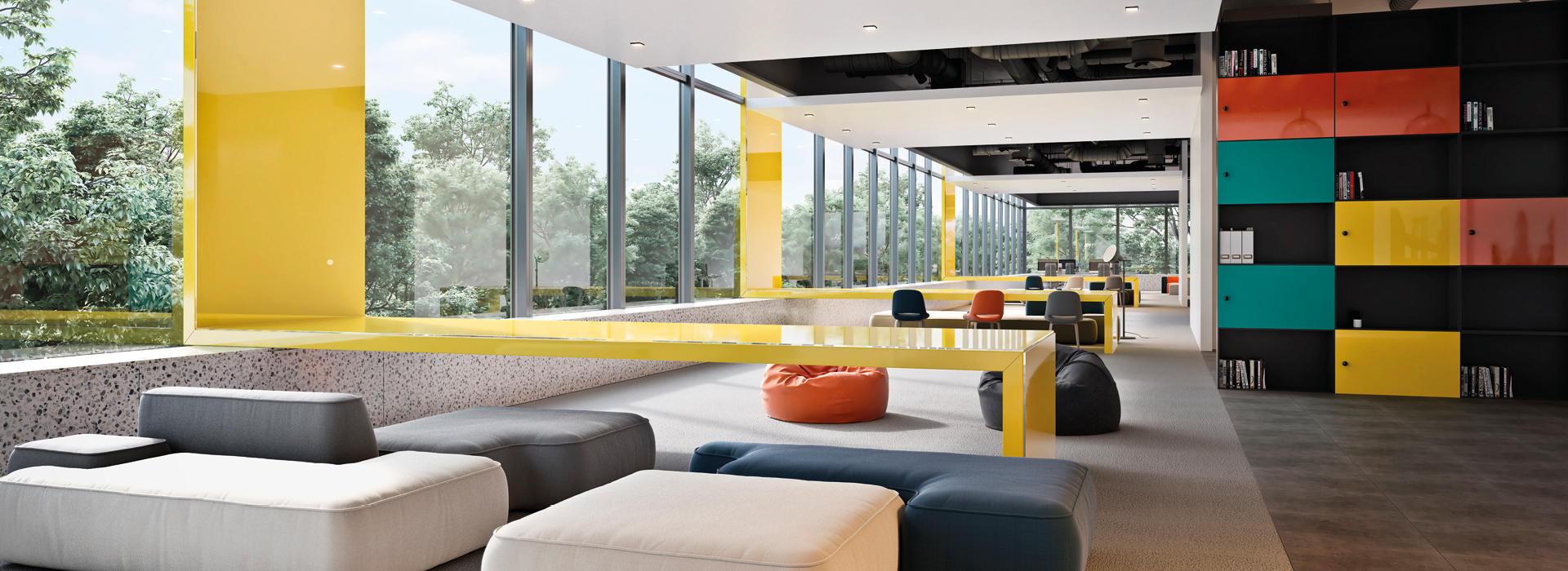 Los productos de vidrio lacado Lacobel ofrecen infinitas posibilidades como revestimiento de paredes y de mobiliario para cualquier proyecto de interiorismo. La gama se combina sutilmente con una gran variedad de materiales, como la madera, la piedra y el metal. Si se requiere de mayores niveles de seguridad para una determinada aplicación, es posible aplicar una película SAFE+ de polipropileno transparente en la cara lacada del Lacobel para garantizar, que en caso de rotura, los fragmentos de vidrio se mantengan unidos, evitando así lesiones. El vidrio lacado brillante Lacobel está disponible en 13 colores.