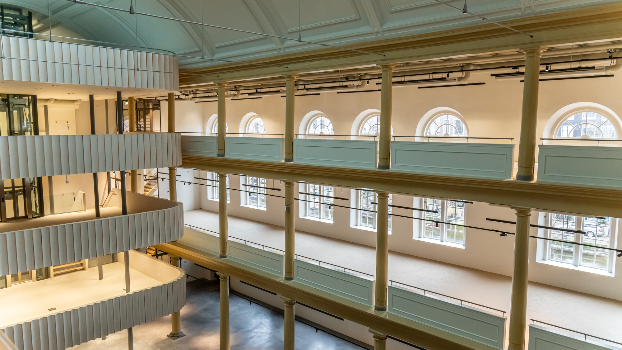 Het transformeren van 2.800 m² kantoorruimte tot één open omgeving betekende het heropenen van galerijen en loopbruggen en het creëren van een brandcompartiment van meer dan 1.000 vierkante meter. In een zo dichtbebouwd gebied in het historische centrum van Amsterdam moest de brandwerendheid in de gevel worden geïntegreerd in plaats van in het gebouw zelf. “Dit alles zou niet mogelijk zijn geweest zonder Pyrobel Fineo beglazing,” zegt Allard Meine Jansen van Allard Architecture.